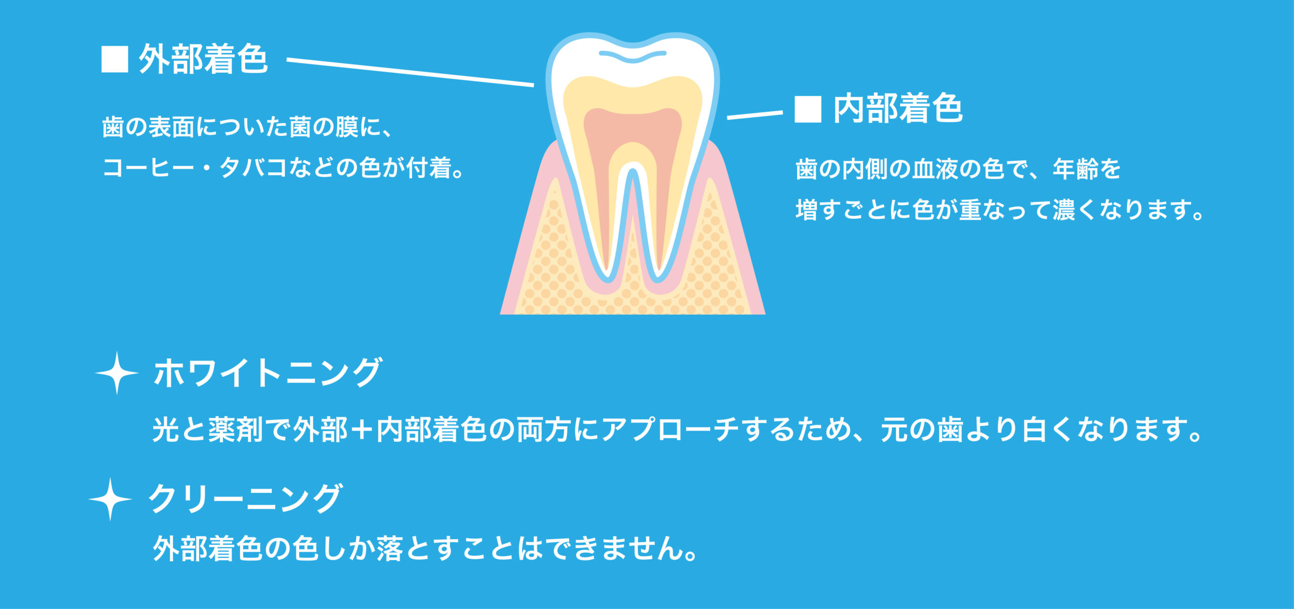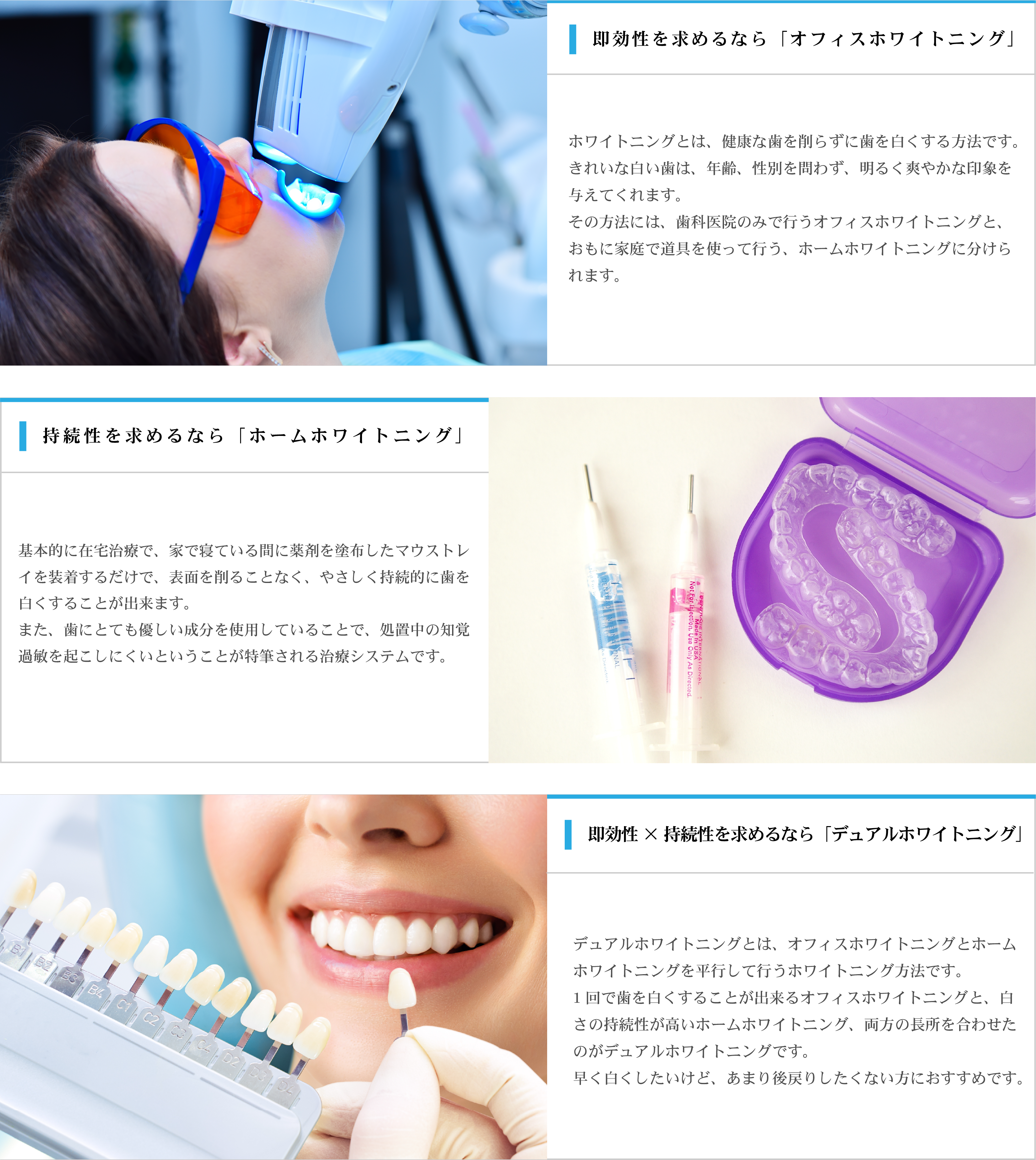 ホワイトニング専門の歯科医師、歯科衛生士が効果や副作用について診断、アフターフォローを行います。